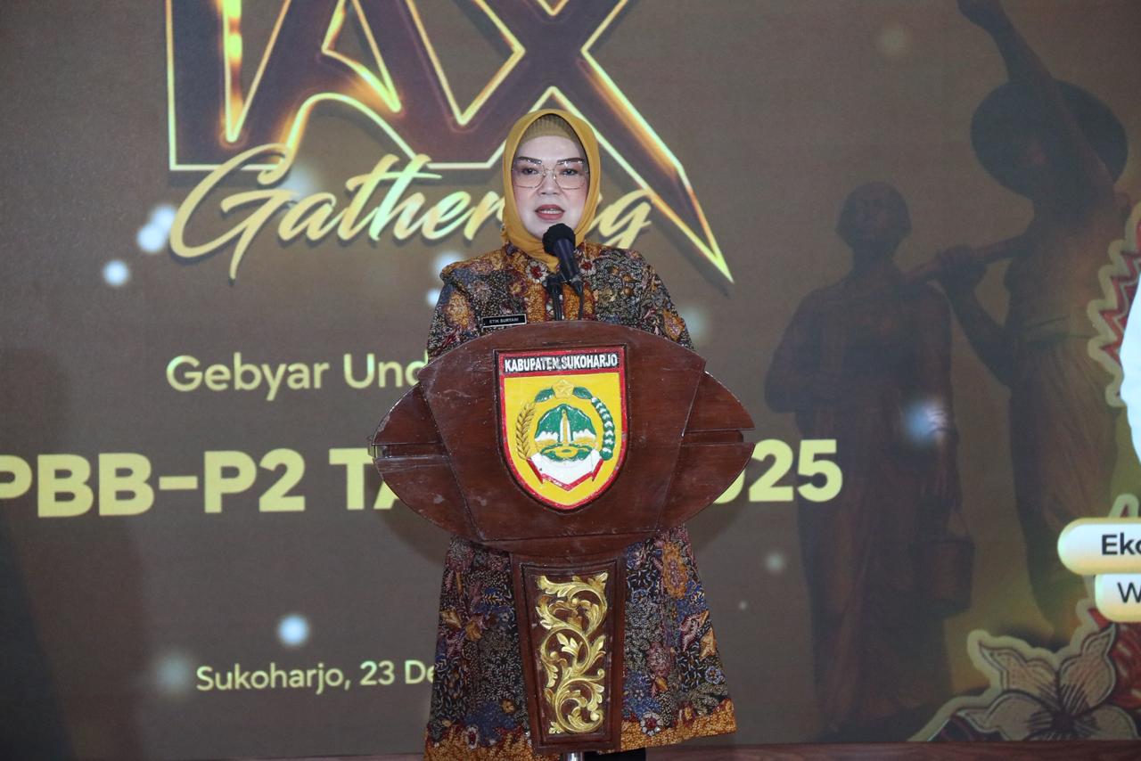 Apresiasi tersebut disampaikan Bupati Sukoharjo Hj. Etik Suryani dalam acara Tax Gathering Gebyar Undian Hadiah PBB-P2 Tahun 2025 di Graha Satya Praja Kabupaten Sukoharjo, Selasa (23/12/2025).