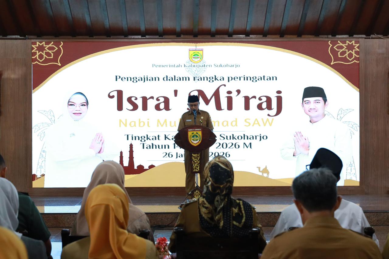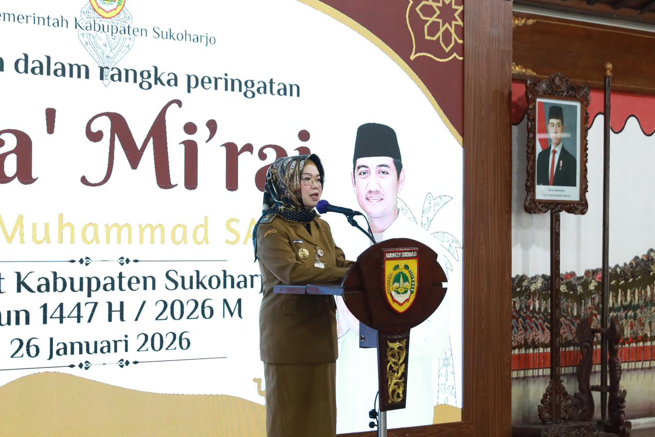 Hal itu disampaikan Bupati Sukoharjo Hj. Etik Suryani dalam sambutan pada acara Pengajian Peringatan Isra Mi’raj Nabi Muhammad SAW Tingkat Kabupaten Sukoharjo Tahun 1447 H/2026 M di Pendopo Graha Satya Praja, Senin (27/1/2026) pagi.