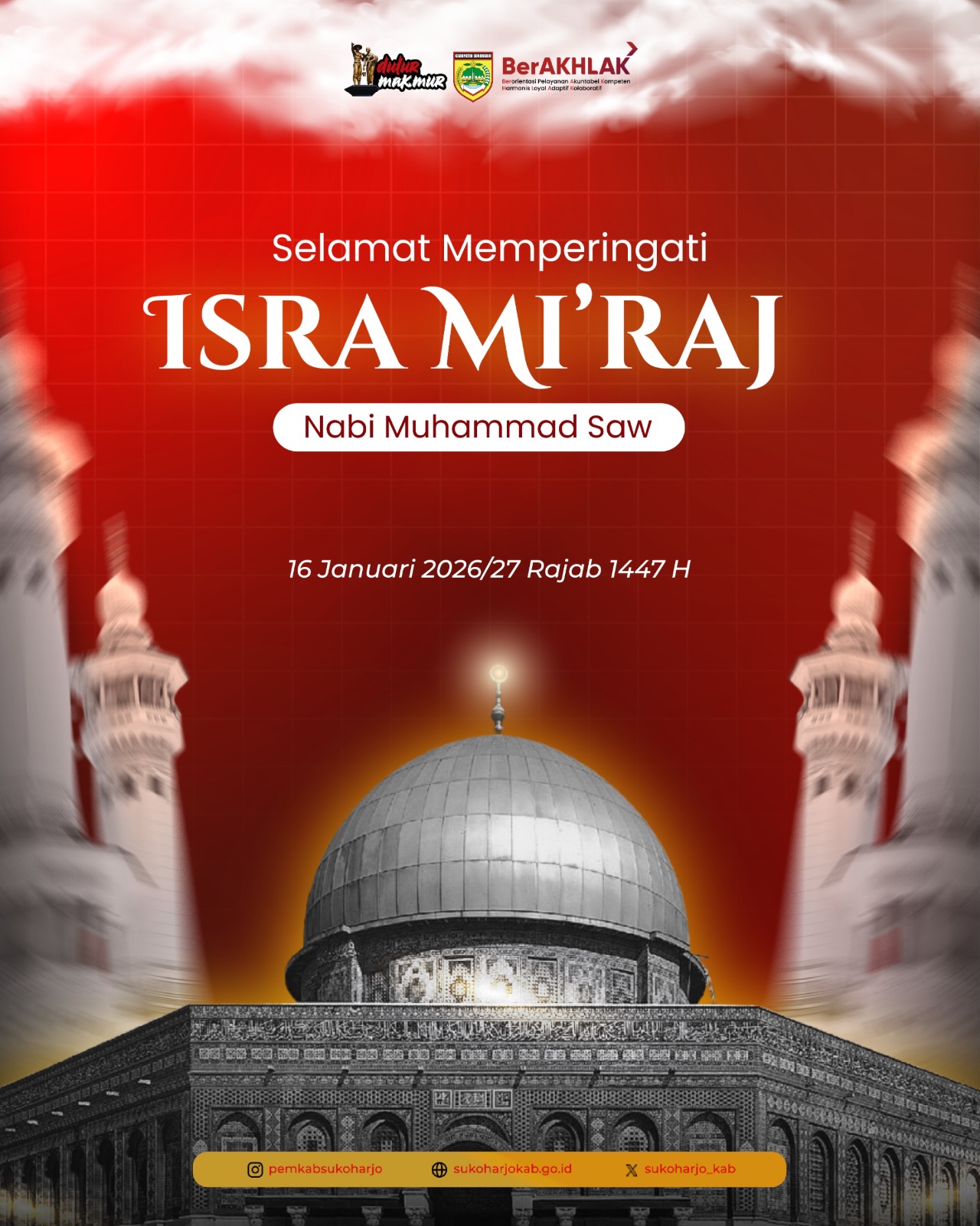 Pemerintah Kabupaten Sukoharjo beserta jajaran mengucapkan Selamat memperingati Isra Mi’raj Nabi Muhammad SAW. Semoga nilai-nilai keteladanan Rasuulullah senantiasa membimbing langkah kita menuju kebaikan....