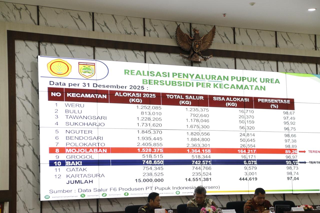 Baca SelanjutnyaSUKOHARJO – Pemerintah Kabupaten Sukoharjo menggelar Rapat Koordinasi Penyaluran Pupuk Bersubsidi Tahun Anggaran 2026 Serta Pembinaan PPTS Kabupaten Sukoharjo di Auditorium Wijaya Utama Lantai 10 Gedung Menara Wijaya, Kamis (15/1/2026). Kegiatan ini dibuka oleh Asisten Perekonomian dan Pembangunan Sekda Kabupaten Sukoharjo, Suyamto, S.T M.Kom yang hadir mewakili Sekretaris Daerah. Hadir dalam acara tersebut Kepala Perangkat Daerah, Produsen, Distributor, Penyuluh Pertanian Lapangan (PPL), serta Penerima Pupuk pada Titik Serah (PPTS) se-Kabupaten Sukoharjo. Dalam arahannya, Suyamto menyampaikan kabar gembira terkait penurunan harga pupuk yang...