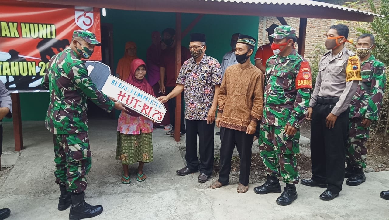 Penyerahan rumah yang dibangun secara berogotong royong antara Koramil 11 Polokarto, Warga, Polri, Pemdes dan semua fihak yang terkait ini dalam rangka memperingati HUT TNI ke 75 Tahun 2020. Kegiatan penyerahan rumah dihadir sekitar 30 orang.